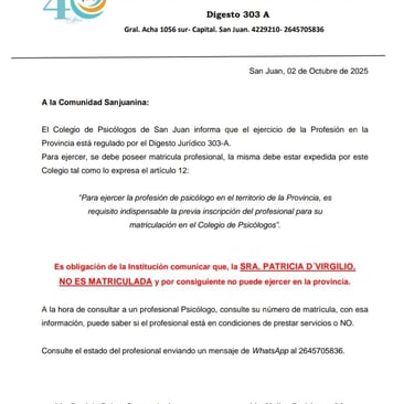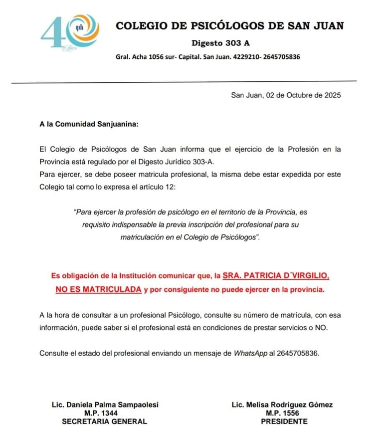 Un grave caso de intrusismo profesional sacude al departamento de 9 de Julio y pone en jaque la credibilidad de sus instituciones. El Colegio de Psicólogos de San Juan ha presentado una denuncia formal contra una persona del área de Educación de la municipalidad, acusándola de ejercer ilegalmente la psicología, atendiendo a niños sin poseer el título ni la matrícula habilitante.